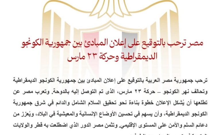 ترحب جمهورية مصر العربية بالتوقيع على إعلان المبادئ بين جمهورية الكونجو الديمقراطية وتحالف نهر الكونجو – حركة ٢٣ مارس، الذى تم التوصل إليه بالدوحة. وتعرب مصر عن تطلعها أن يُشكل الإعلان خطوة بناءة نحو تحقيق السلام الشامل والدائم في شرق جمهورية الكونجو الديمقراطية، وأن يسهم في تحسين الأوضاع الإنسانية والمعيشية في البلاد، ويُعزز من دعائم السلم والأمن على المستوى الإقليمي. وتثمن مصر الدور الذي اضطلعت به قطر والولايات المتحدة في تيسير الحوار بين الطرفين.