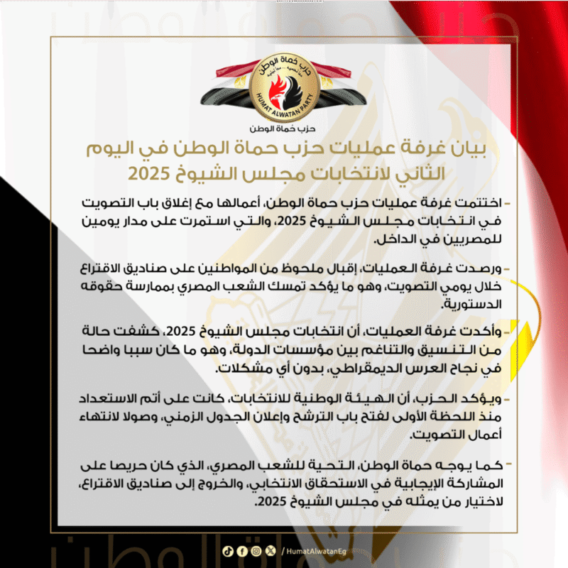 بيان غرفة عمليات حزب حماة الوطن في اليوم الثاني لانتخابات مجلس الشيوخ 2025