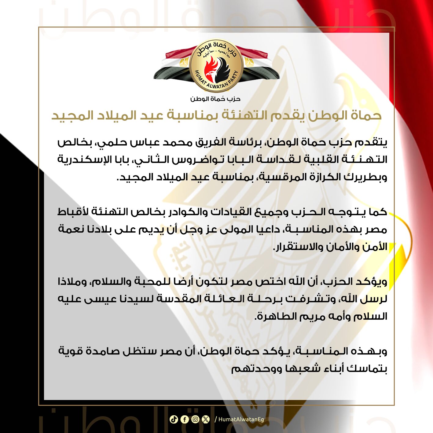 يتقدم حزب حماة الوطن، برئاسة الفريق محمد عباس حلمي، بخالص التهنئة القلبية لقداسة البابا تواضروس الثاني، بابا الإسكندرية وبطريرك الكرازة المرقسية، بمناسبة عيد الميلاد المجيد.