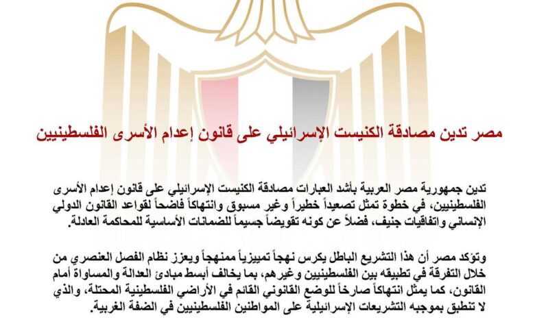 تدين جمهورية مصر العربية بأشد العبارات مصادقة الكنيست الإسرائيلي على قانون إعدام الأسرى الفلسطينيين، في خطوة تمثل تصعيداً خطيراً وغير مسبوق وانتهاكاً فاضحاً لقواعد القانون الدولي الإنساني واتفاقيات جنيف، فضلاً عن كونه تقويضاً جسيماً للضمانات الأساسية للمحاكمة العادلة.